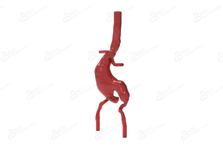 A silicone abdominal aortic aneurysm (AAA) model with large infrarenal aneurysm and notable iliac tortuosity representative of diseased vasculature. This silicone AAA vasculature is suitable for endovascular stent graft development, testing, marketing and physician training purposes. Upon request, the BDC team can adjust the aneurysm and/or iliac tortuosity, as well as integrate calcification to meet our client’s needs.