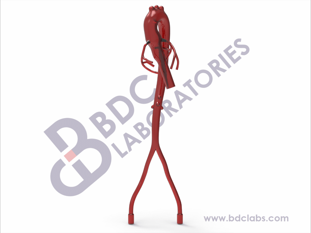Aorta model with femoral and coronary arteries representative of healthy vasculature. Branch vessels are not present in this model. This silicone model is suitable for development, testing, marketing and physician training purposes for coronary, thoracic aorta, abdominal aorta and femoral interventional devices; moreover, this vasculature is common for BDC’s Coronary Artery Simulation Solution. Upon request, the BDC team can integrate a custom aneurysm, dissection or calcification into this vasculature at any location.