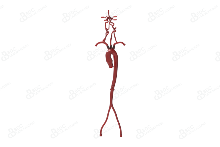 Silicone aorta model with femoral arteries and Circle of Willis, including the vertebral, internal and external carotid arteries, representative of diseased vasculature. An aneurysm and notable tortuosity in present in the neurovascular arteries. This model is suitable for development, testing, marketing and physician training purposes for carotid artery stenting, intracranial stenting and flow diverters. Upon request, the BDC team can integrate a custom aneurysm, dissection or calcification into this vasculature at any location.