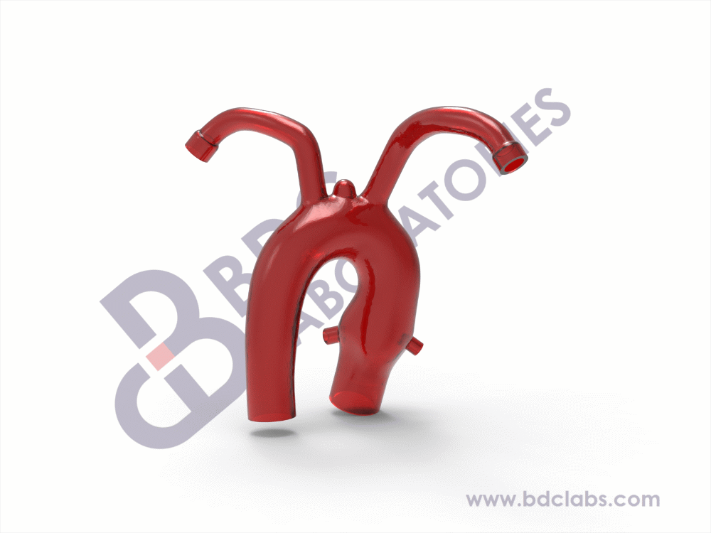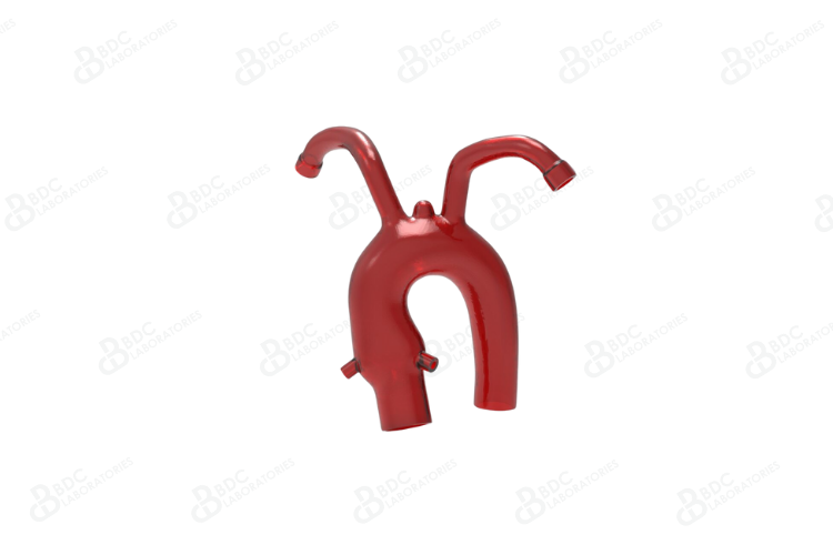 Aortic arch model with coronary ostia, subclavian vessels and sinus representative of healthy vasculature. This silicone aortic arch model is suitable for development, testing, marketing and physician training purposes for thoracic aortic interventional devices. Upon request, the BDC team can integrate a custom aneurysm or dissection into this vasculature at any location.