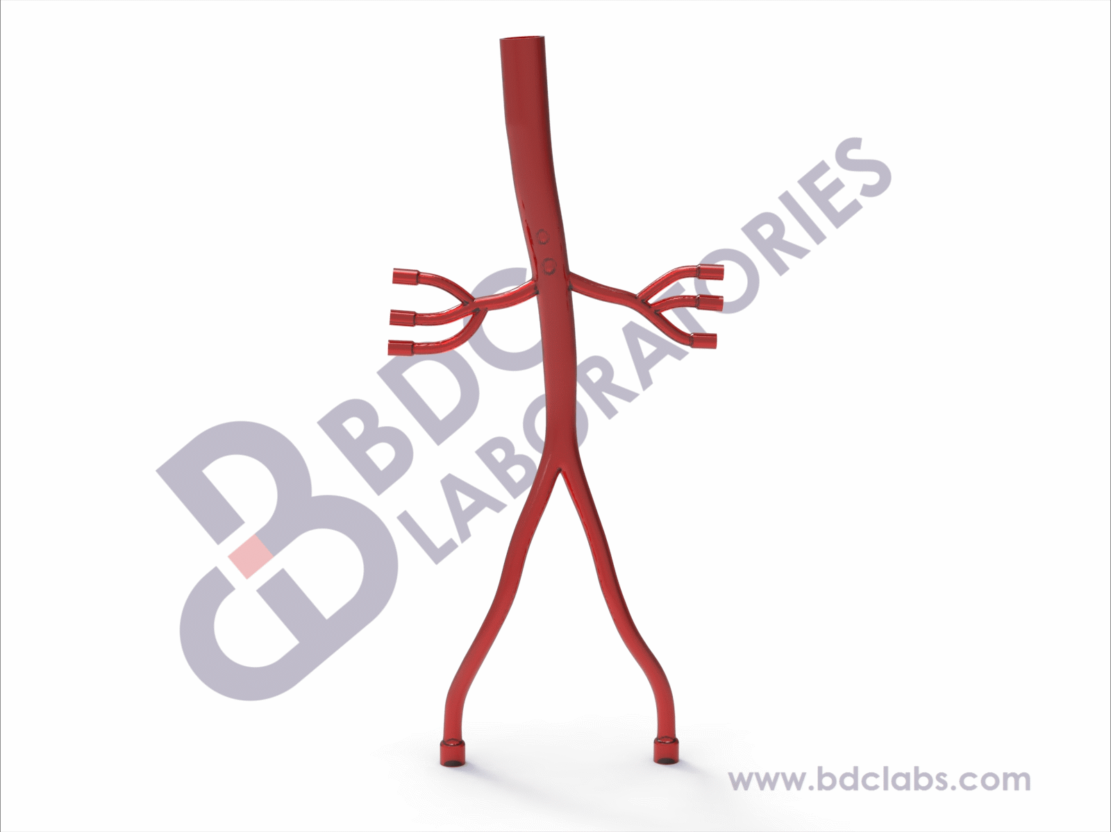 Descending aorta with renal arteries and iliac vessels consistent with the geometry of healthy vasculature. This silicone descending aorta model is suitable for development, testing, marketing and physician training purposes for devices that utilize femoral access for advancement into the descending aorta or contralateral to adjacent iliac artery for therapy, as well as renal artery stenting and other renal therapies. Upon request, the BDC team can integrate a tortuosity or calcification into this vasculature at any location.