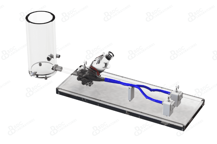 BDC Laboratories designs customizable simulated use solutions to evaluate both mitral valve replacement (TMVR) and mitral valve repair technologies. This system features the right atrium, left atrium, left ventricle, functioning silicone mitral valve with chordae, inferior vena cava, and femoral veins. It can be configured with either a pre-defined septal hole or a replaceable, puncturable septum between the left and right atria. Integrated hemostatic valves at the femoral veins and transapical site facilitate transcatheter delivery system access. Our team can incorporate custom access routes as needed.