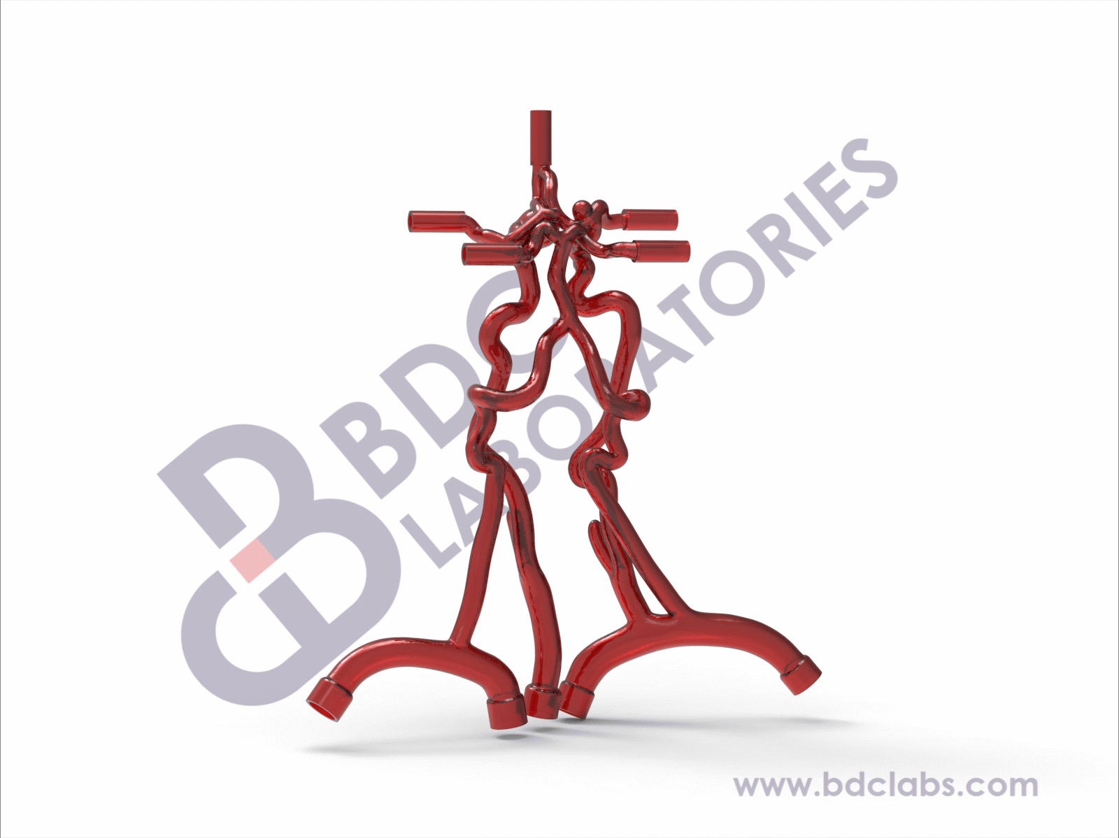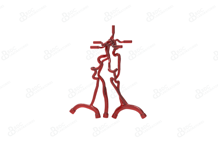 Silicone neurovascular model starting from the branch vessels, distal through the Circle of Willis, and including the vertebral, internal and external carotid arteries representative of diseased vasculature. An aneurysm and notable tortuosity are present in this neurovascular model. This carotid artery and Circle of Willis vasculature can be used to simulate endovascular procedures such as carotid artery stenting, intracranial stenting and flow diverters. Upon request, the BDC team can adjust the aneurysm and/or vessel tortuosity, as well as include calcification to meet our client’s needs.